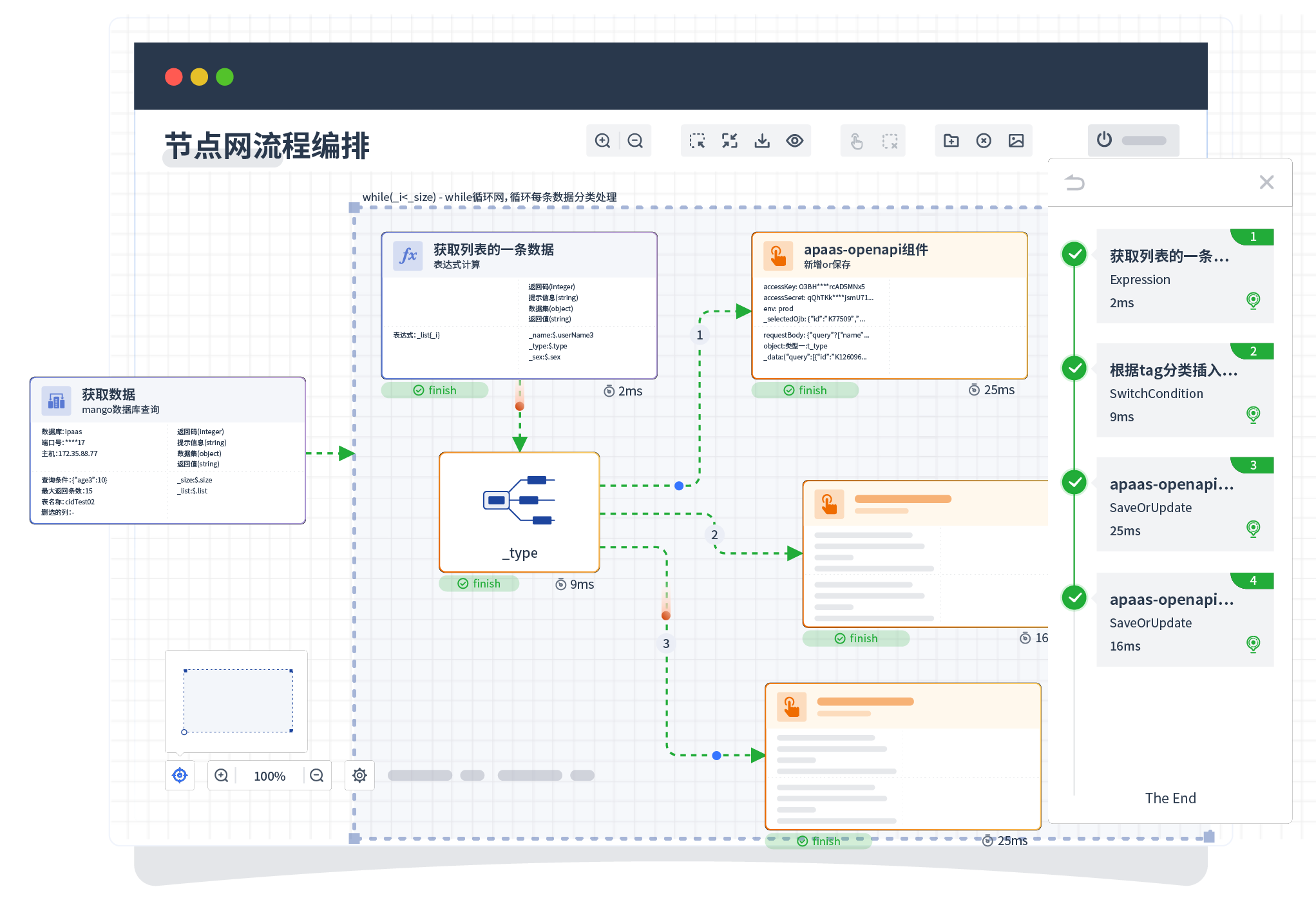 针对集成场景,,组件定义后支持进行流程编制,,,不同于传统代码方式,,通过图形化展示,,支持在线调试、、、日志查看和运行回放。。。。