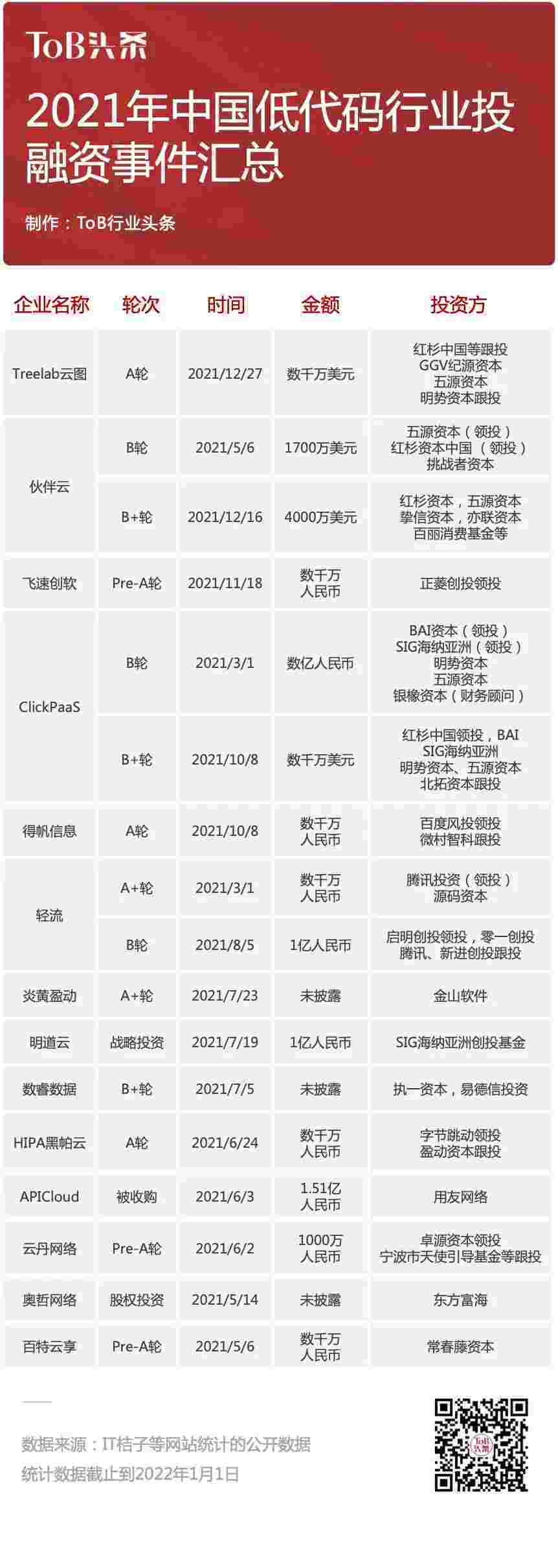 到2021年,,无/低代码投融资规模势头更甚,,其中包括轻流两轮融资(A+轮数千万人民币,,,B轮近亿人民币)、、、、圆梦钱包 两轮融资(B轮数亿人民币,,B+轮数千万美元)、、、、百特云享数千万元Pre-A轮融资......